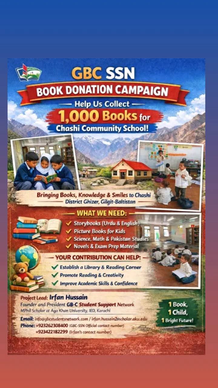 After two months of continuous effort and unwavering community support, GBC SSN has successfully concluded its Book Donation Campaign for the Chashi Community School in District Ghizer, Gilgit-Baltistan. What began as a simple vision—to bring learning opportunities to a remote valley—has blossomed into a monumental achievement for our community.