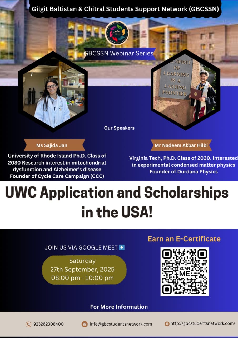 The Gilgit-Baltistan & Chitral Students Support Network (GBCSSN) is thrilled to host an exclusive webinar as part of our series, featuring two inspiring individuals who have successfully navigated this exact path.
